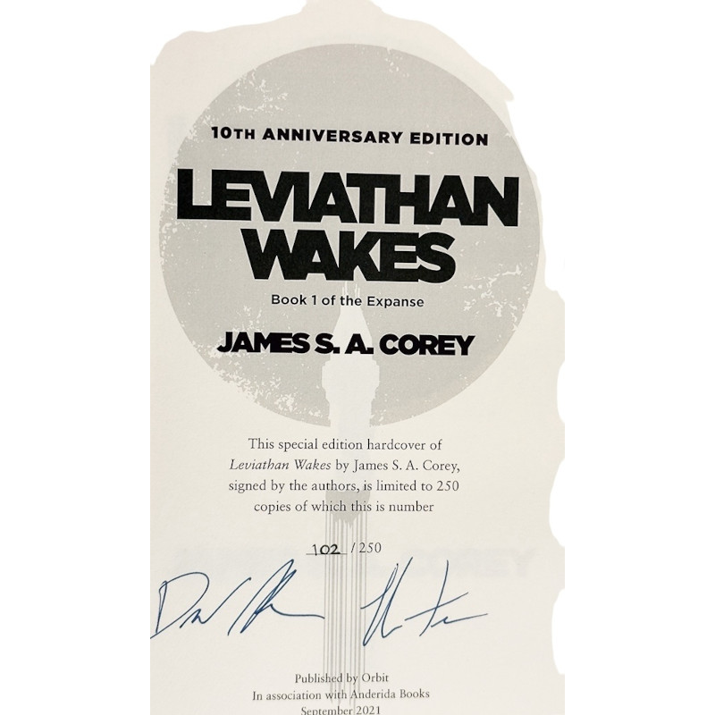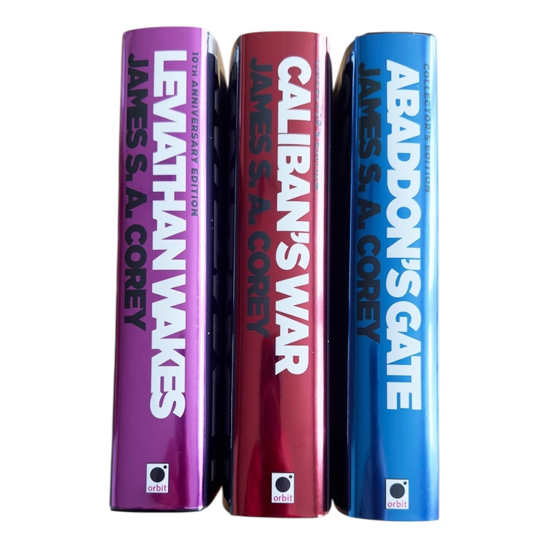 1st Editions, 1st Printings Hardbacks Including the three current 10th Anniversary Editions of books 1, 2, 3 all Collectors (Publishers) UK Editions of the Expanse Series. Leviathan Wakes, Calaiban’s War, Abaddons Gate. Just 250 copies of each printed. All Signed and Matched Numbered 198/250 to a limitation page by Daniel Abraham and Ty Franck. The three books are fine new unread condition with fine jackets. Packed in a strong twin walled carton and protected with great care.