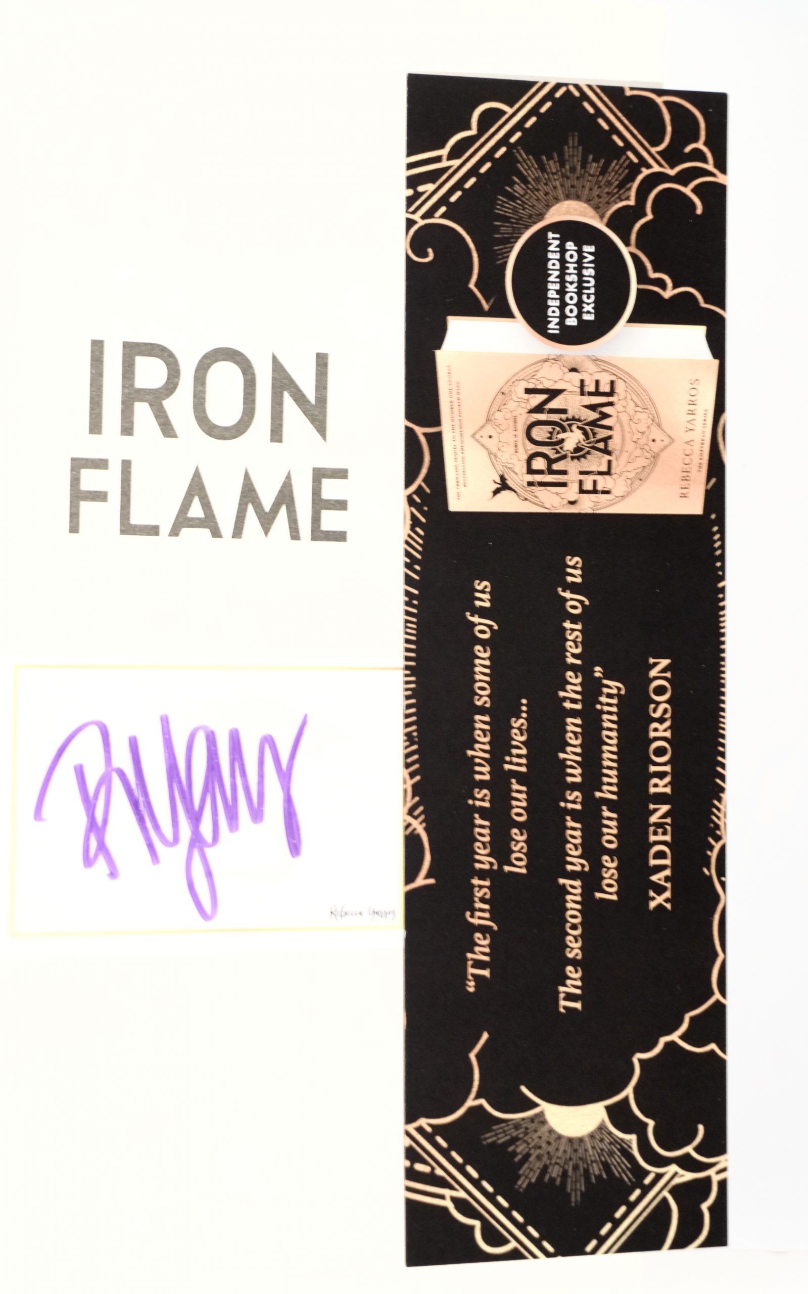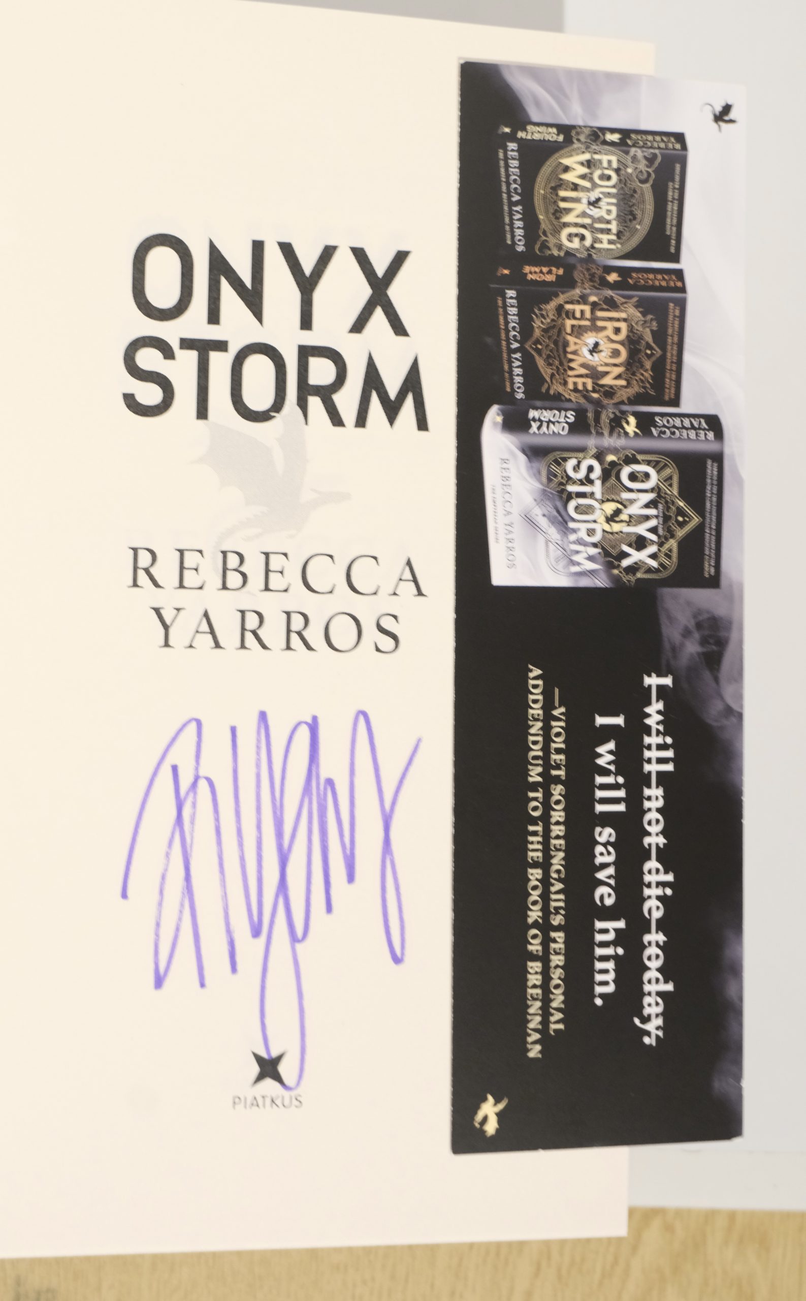 Very Rare 1st three Exclusive Limited Editions . UK Hardcovers of the Empyrean Series. Waterstones Fourth Wing Signed, Waterstones Exclusive edition to a publishers Bookplate. Iron Flame signed to a publishers Bookplate + bookmark, Rare to find a signed copy of Onyx Storm signed in person by Rebecca and Event ticket. They are all 1st Editions, 1st Printings with full Number lines (13579108642). All in Fine, New, Unread condition with fine protected Dust Jackets. Packed securely in a strong twin walled carton with plenty of protection. A rare find.